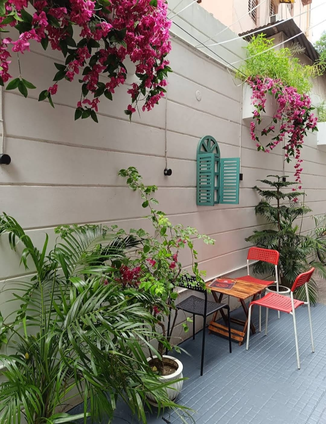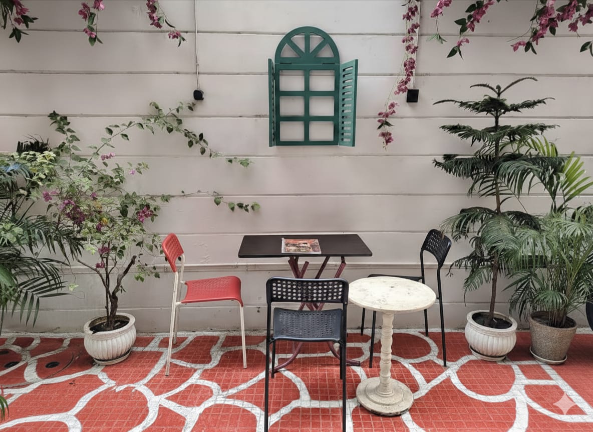We focused on simple yet impactful design elements to bring this Compact Cafe Interior to life. The flooring was finished with a wooden texture combined with creative floor paint, giving it a cozy yet modern vibe. Wall Mouldings and photo frames were added to break the monotony and bring character to the interiors. Carefully chosen plants and natural décor elements were introduced to make the space fresh and inviting. To enhance the atmosphere further, we used a playful color palette that tied together both the indoor AC zone and the outdoor seating area.